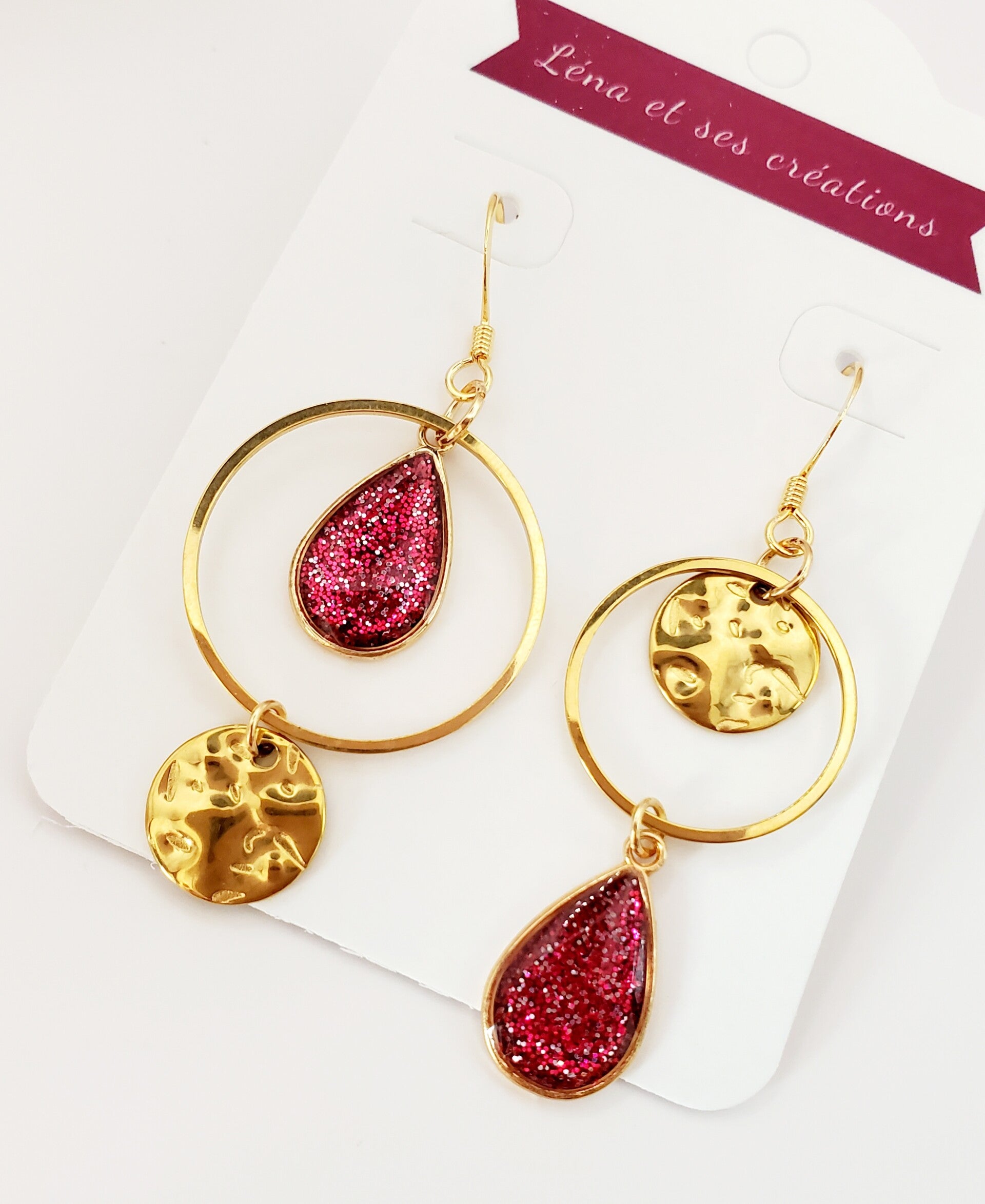 Boucles "Gouttes Dorées Asymétriques Fuschias"