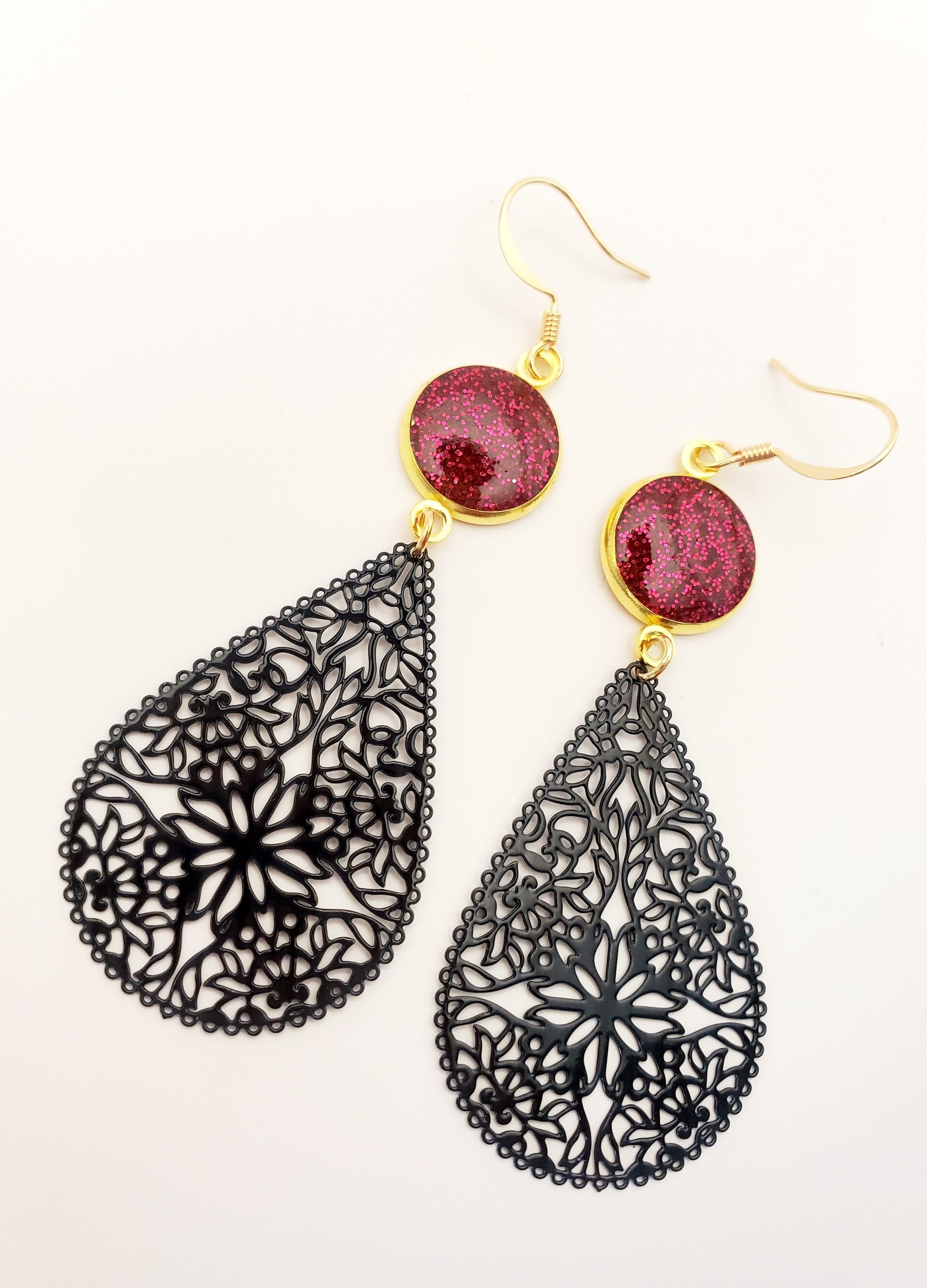 Crochets en laiton plaqués Or 18K , cabochons en acier inoxydable et breloques filigranes.