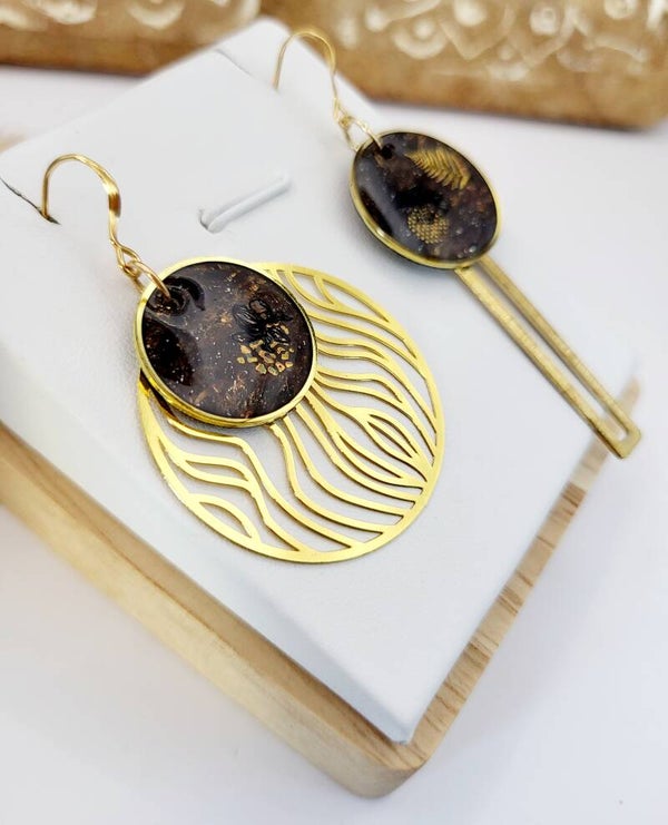 Boucles " polymère asymétriques brunes et motifs dorés "
