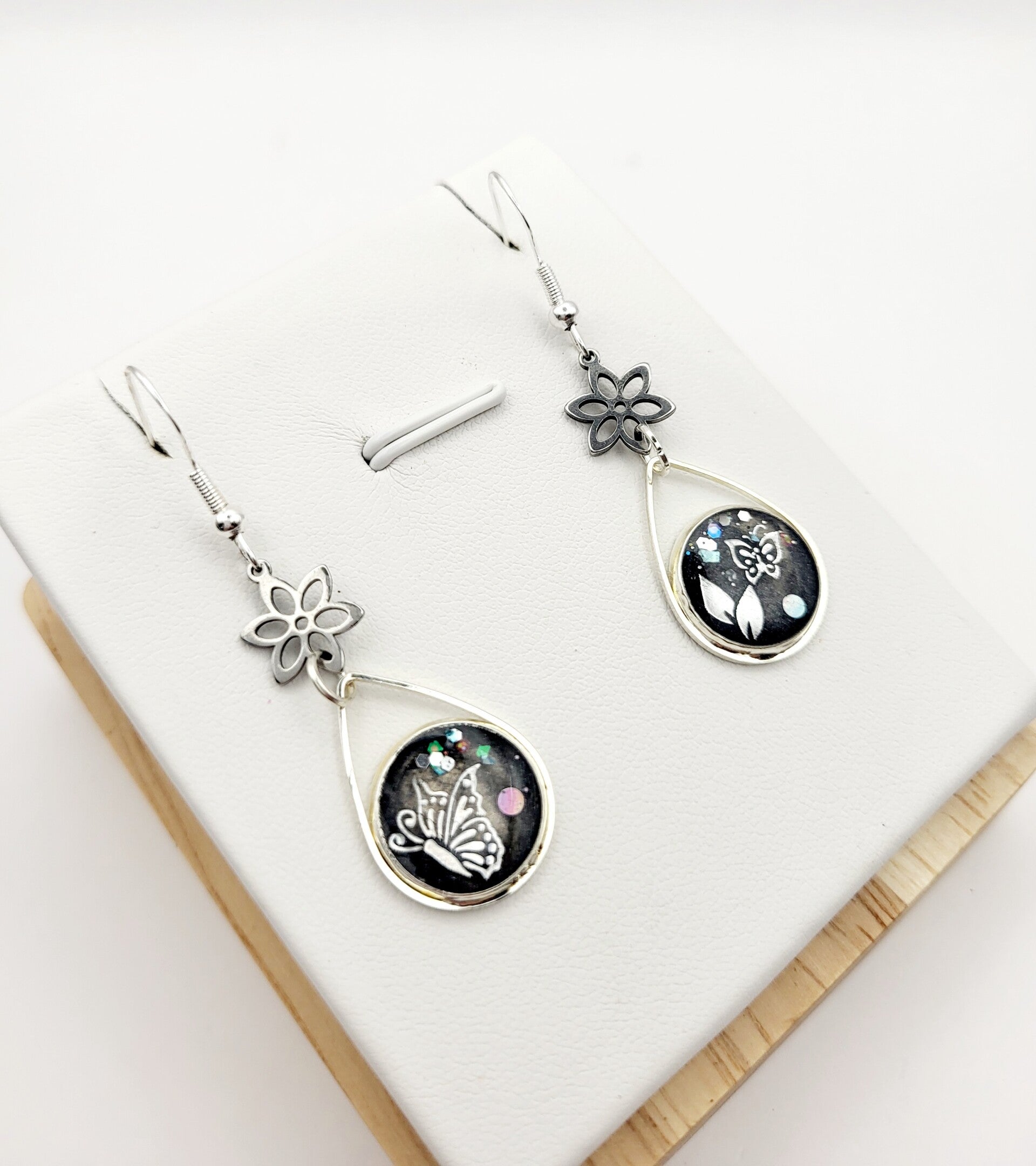 Boucles " noires papillons argentés "