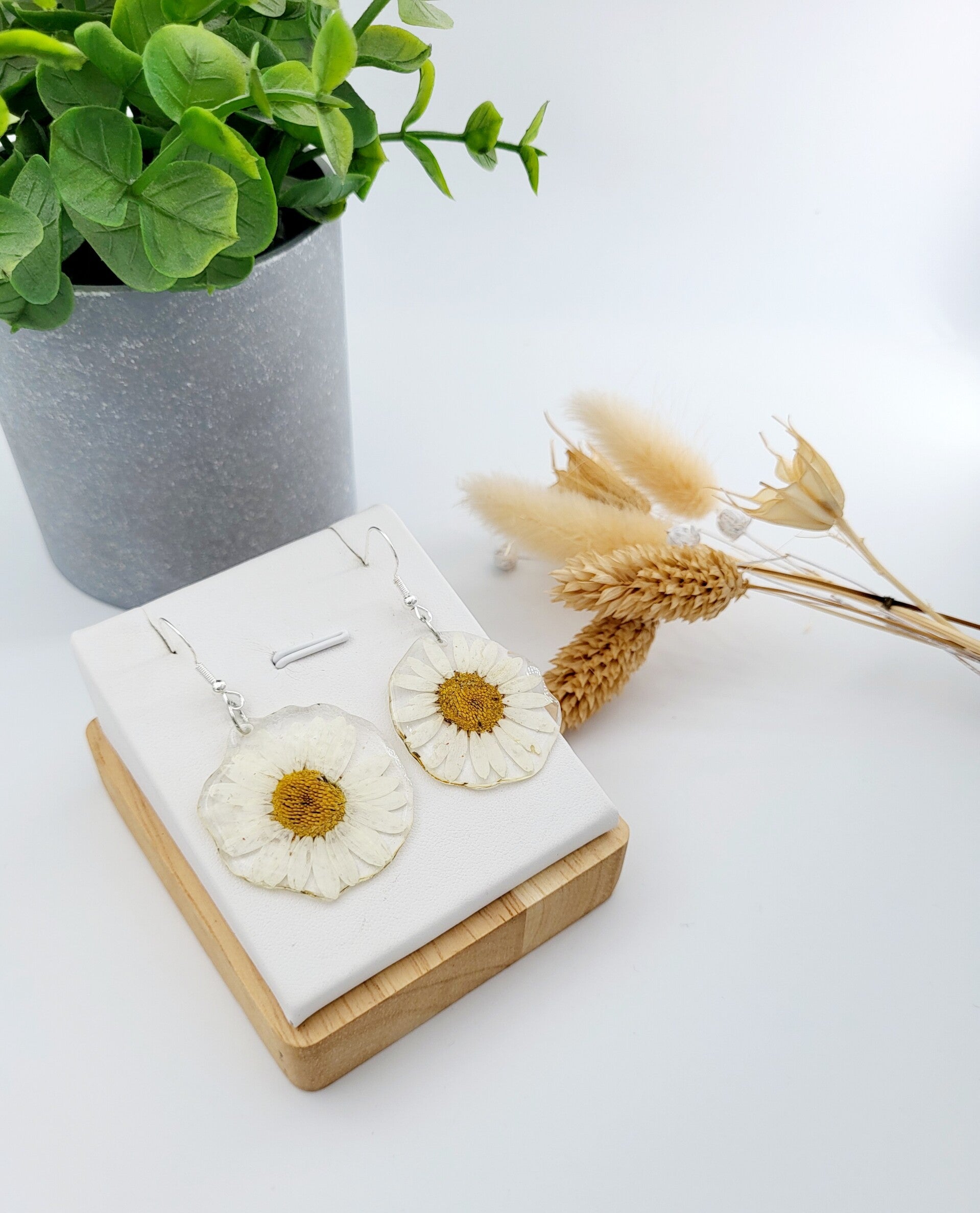 Les fleurs sont cueillies et séchées par mes soins. Elles sont ensuite recouvertes de résine des deux côtés.
